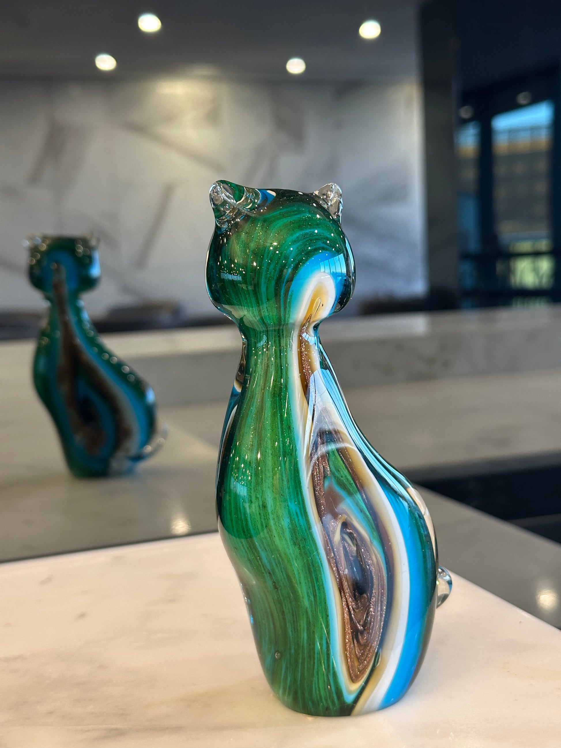 Graceful and enigmatic, the Emerald Treasure Cat captures the silent poise of a feline in a single fluid form. Hand-blown from artisan glass, this piece harmoniously blends deep emerald green with rich amber-brown veining. The curves of the body mimic the effortless flow of a cat at rest, while its upright ears and subtly arched back suggest a moment of attentive stillness.