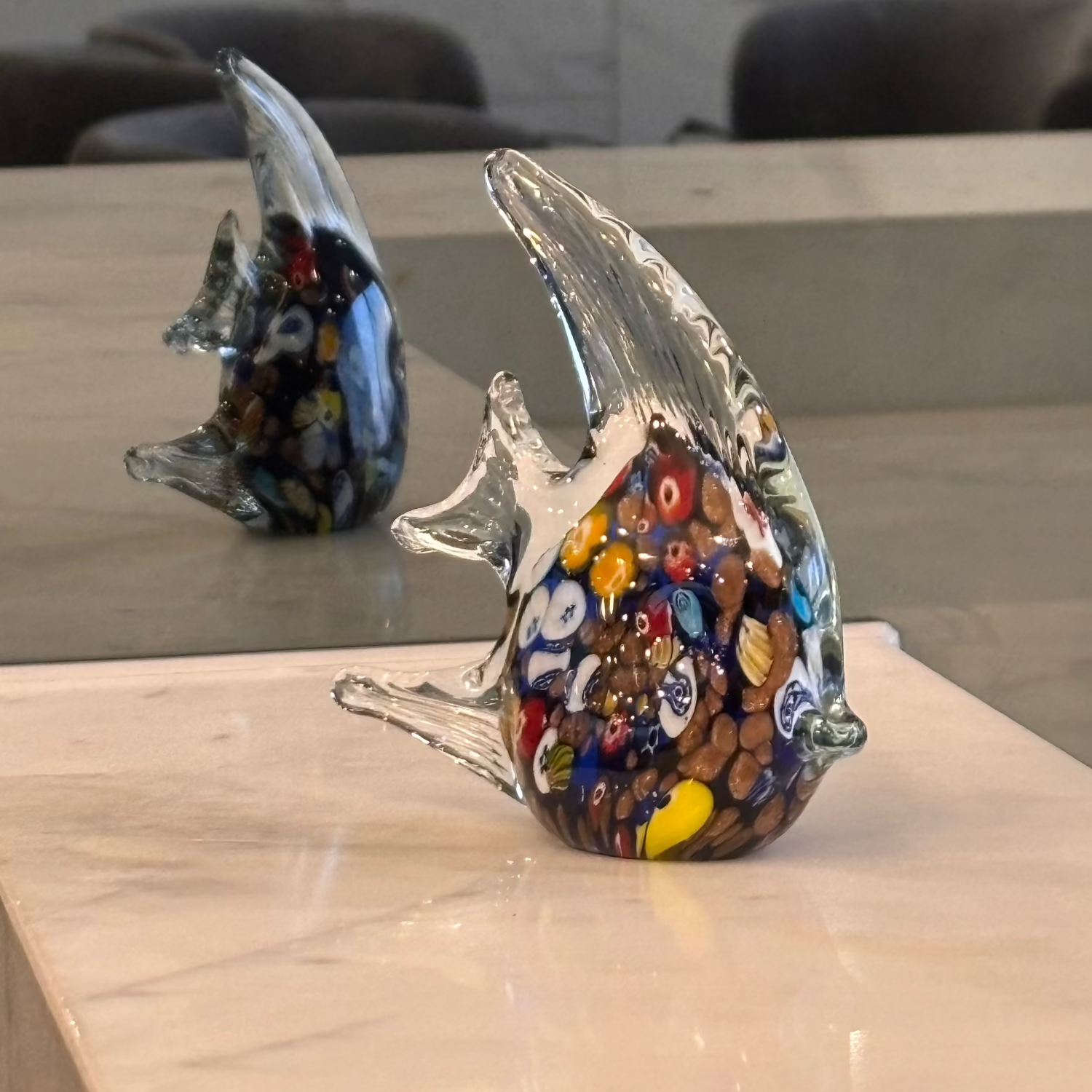 Inspired by the graceful movement and intricate design of ocean life, the Millefiori Baby Angel Fish encapsulates the spirit of the sea. The piece is an artistic interpretation of nature's diverse beauty, with its clear body and colourful millefiori glass details that evoke the dazzling array of life found in coral reefs. The flowing form of the angel fish represents the effortless movement of these aquatic creatures, while the rich, colourful pattern adds an element of charm and joy.