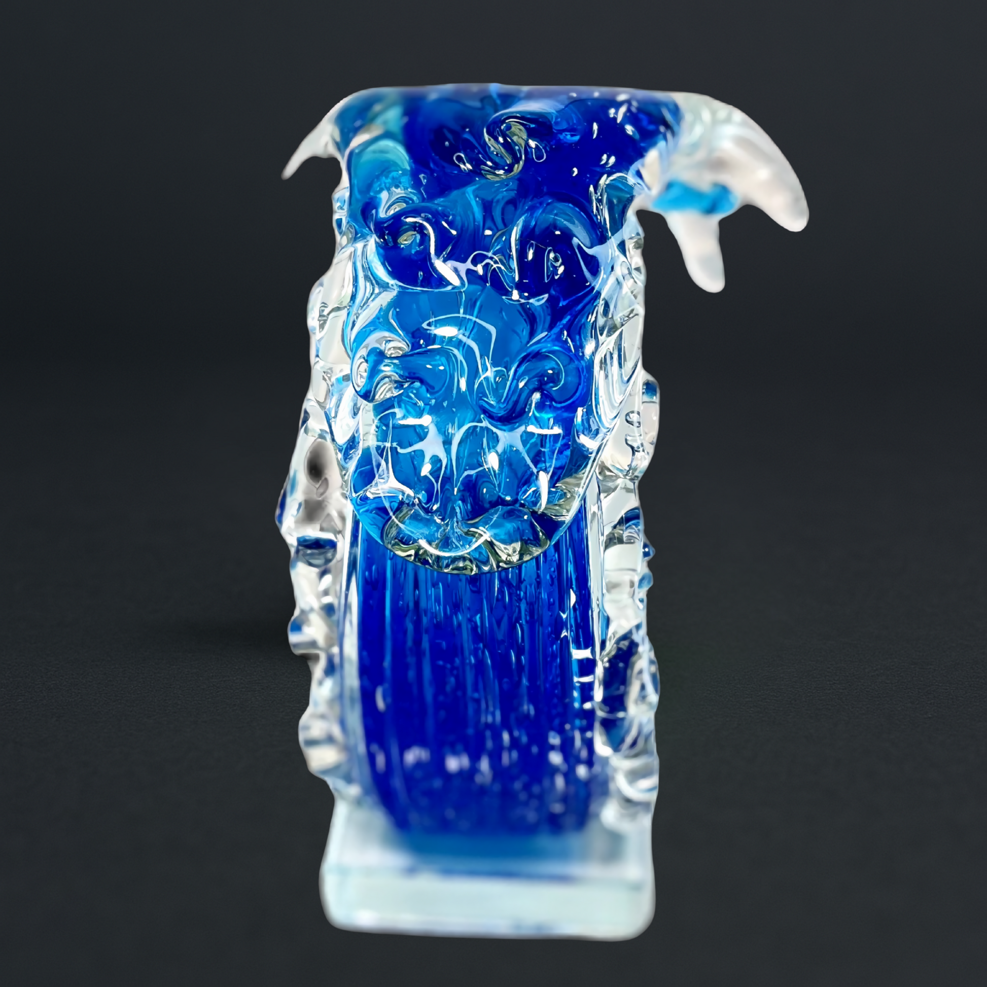 Kenjasper captures the untamed spirit of the sea. A brilliant wave, swirling in deep sapphire blue and crystal-clear accents, rises with graceful motion and timeless power. Resting on a polished glass base, this piece embodies both elegance and energy.